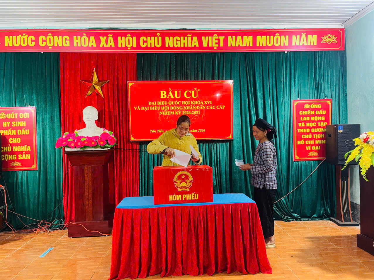 Toàn xã Tân Tiến có 16 khu vực bỏ phiếu được bố trí tại các thôn, tạo điều kiện thuận lợi cho Nhân dân đến tham gia bầu cử. Các khu vực bỏ phiếu được trang trí cờ Tổ quốc, cờ Đảng, băng rôn, khẩu hiệu trang trọng; danh sách cử tri, danh sách người ứng cử và nội quy bầu cử được niêm yết đầy đủ theo quy định.