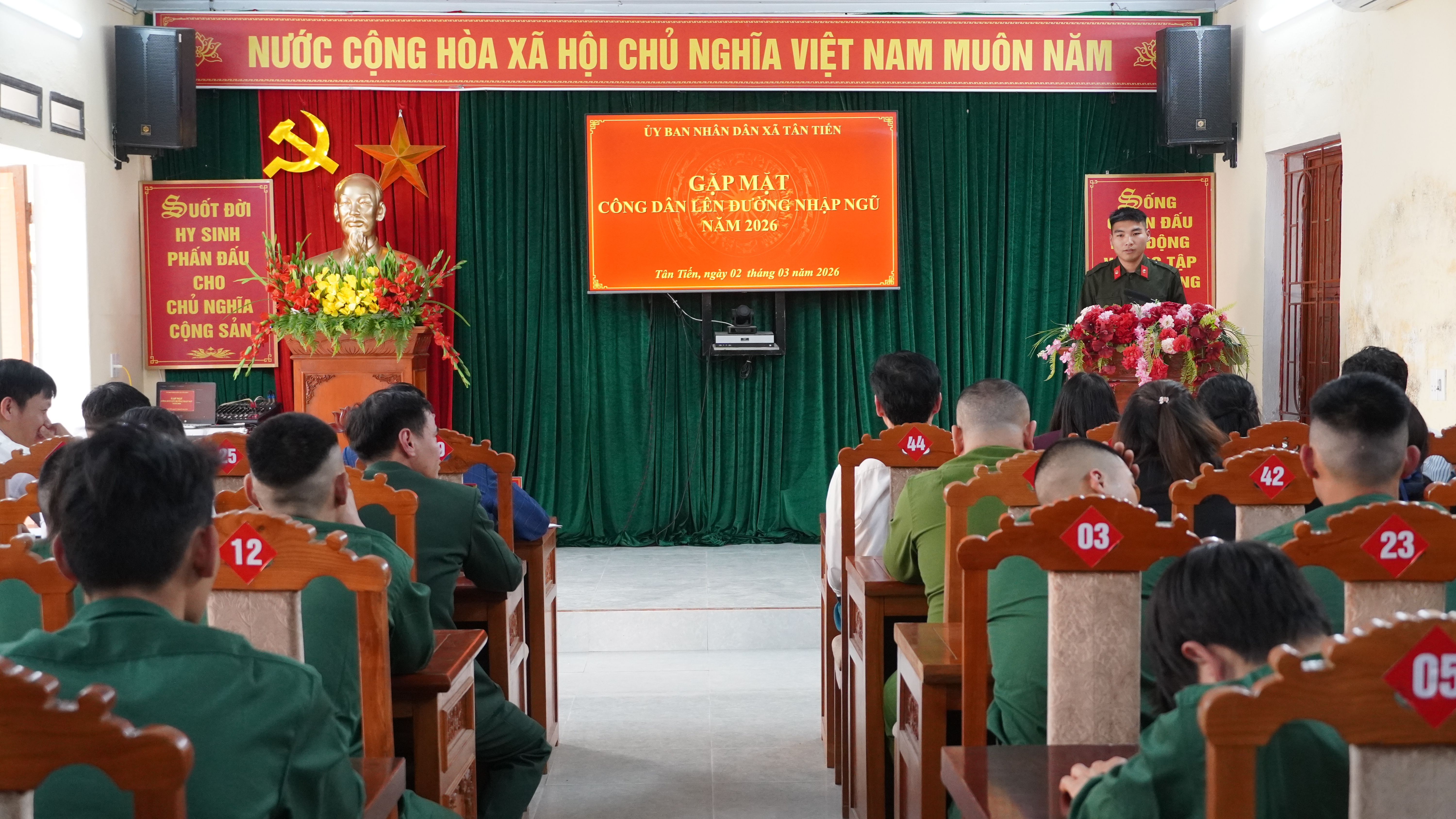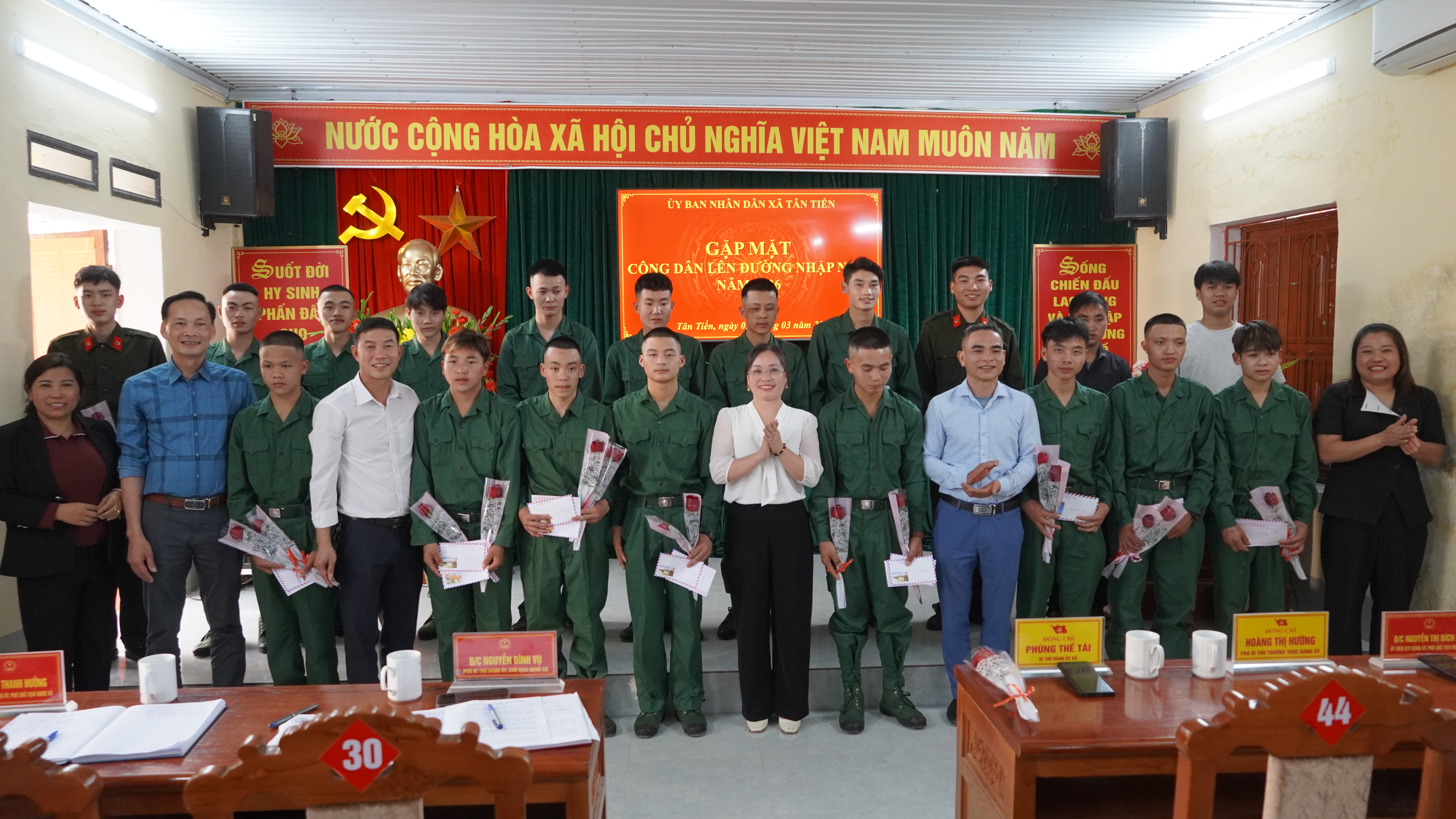 Tham dự buổi gặp mặt, có đồng chí Phùng Thế Tài – Bí thư Đảng uỷ, Chủ tịch HĐND xã, Hoàng Thị Hường – Phó bí thư Thường trực đảng uỷ; dồng chí Nguyễn Đình Vụ - Phó bí thư Đảng uỷ, Chủ tich UBND xã; các đồng chí trong thường trực HĐND, UBND, Uỷ ban MTTQVN, thành viên hội đồng nghĩa vụ quân sự xã; đại diện cac ban, ngành, đoàn thể, các trường học trên địa bàn xã; bí bí thư chi bộ, trưởng thôn cùng các tân binh và gia đình các tân binh.