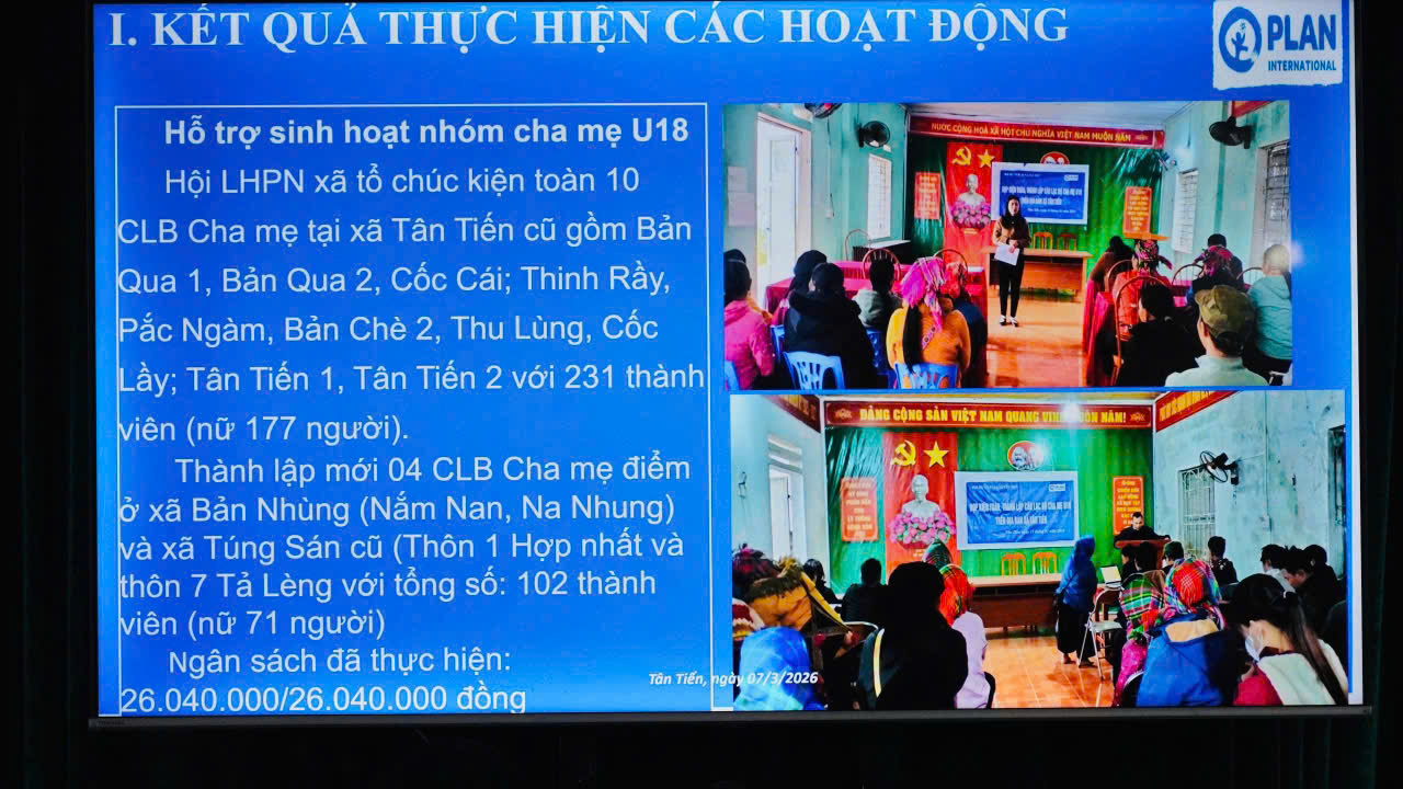 Trong lĩnh vực bảo vệ trẻ em, Hội Liên hiệp Phụ nữ xã Tân Tiến đã kiện toàn 10 Câu lạc bộ Cha mẹ tại các thôn thuộc địa bàn xã Tân Tiến với 231 thành viên, trong đó có 177 thành viên nữ. Đồng thời, dự án hỗ trợ thành lập 04 Câu lạc bộ Cha mẹ điểm tại xã Bản Nhùng (cũ) và xã Túng Sán (cũ) với 102 thành viên tham gia, trong đó 71 thành viên nữ. Trong Quý I năm 2026, các câu lạc bộ đã tổ chức 14 buổi sinh hoạt với khoảng 330 lượt thành viên tham gia, tập trung vào các nội dung về kỹ năng nuôi dạy con, chăm sóc và bảo vệ trẻ em. Tổng kinh phí thực hiện hoạt động là 26.040.000 đồng, đạt 100% kế hoạch.