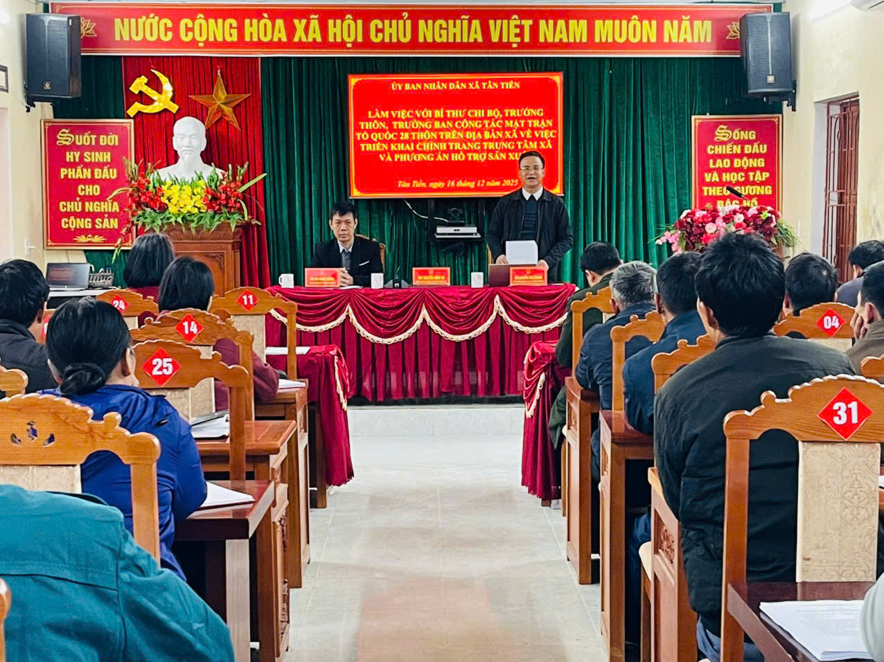 Thực hiện nhiệm vụ phát triển kinh tế – xã hội, xây dựng nông thôn mới và nâng cao đời sống nhân dân, ngày 16/12, UBND xã Tân Tiến đã tổ chức buổi làm việc với Bí thư chi bộ, Trưởng thôn và Ban Công tác Mặt trận Tổ quốc của 28 thôn trên địa bàn xã nhằm triển khai kế hoạch chỉnh trang trung tâm xã và thảo luận phương án hỗ trợ sản xuất trong thời gian tới.