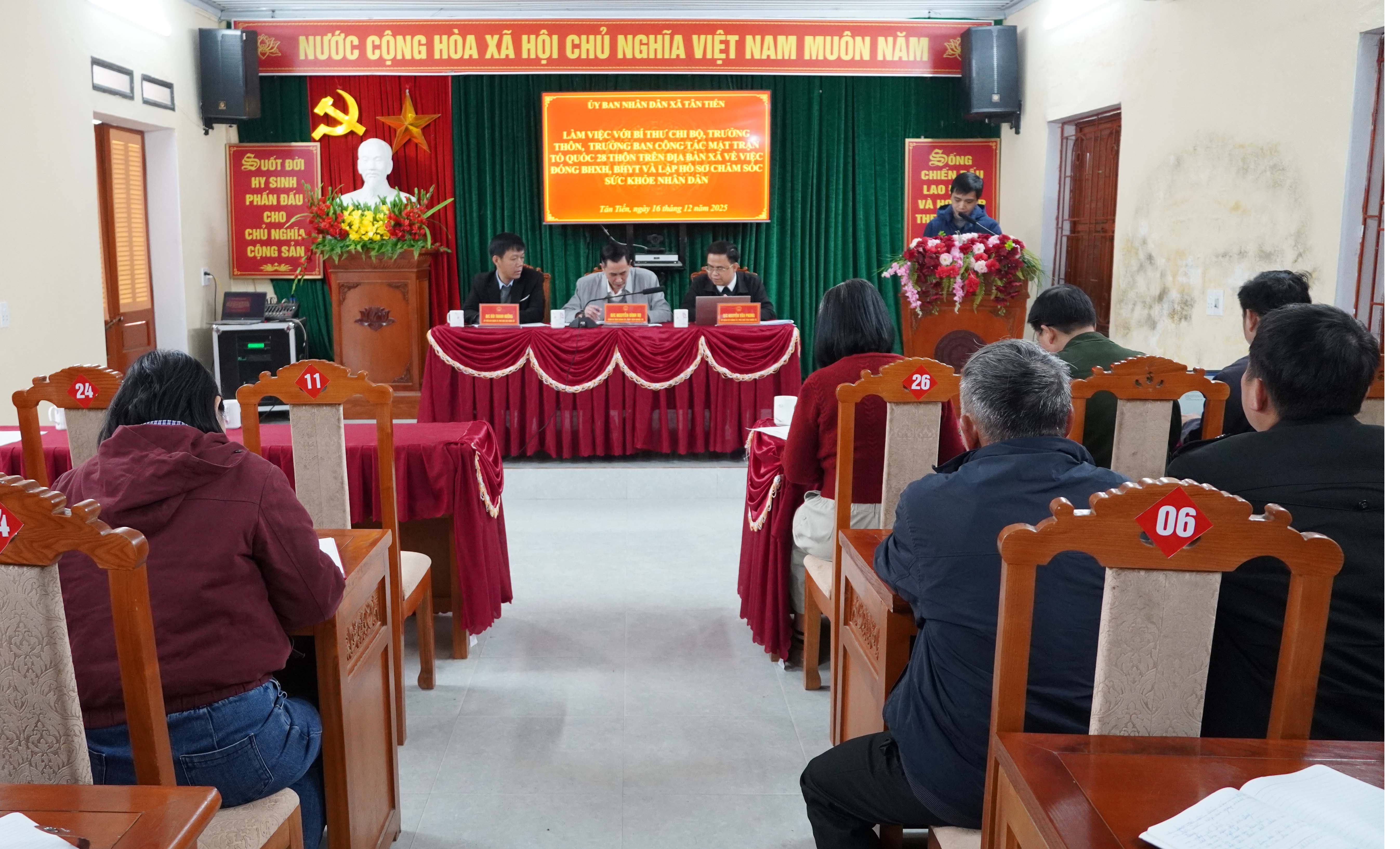 Thực hiện các chủ trương của Đảng, chính sách, pháp luật của Nhà nước về bảo đảm an sinh xã hội và chăm sóc, bảo vệ sức khỏe nhân dân, sáng ngày 16/12, UBND xã Tân Tiến đã tổ chức buổi làm việc với Bí thư chi bộ, Trưởng thôn và Ban Công tác Mặt trận Tổ quốc của 28 thôn trên địa bàn xã nhằm triển khai các nội dung liên quan đến việc tham gia bảo hiểm xã hội (BHXH), bảo hiểm y tế (BHYT) và lập sổ chăm sóc sức khỏe nhân dân.