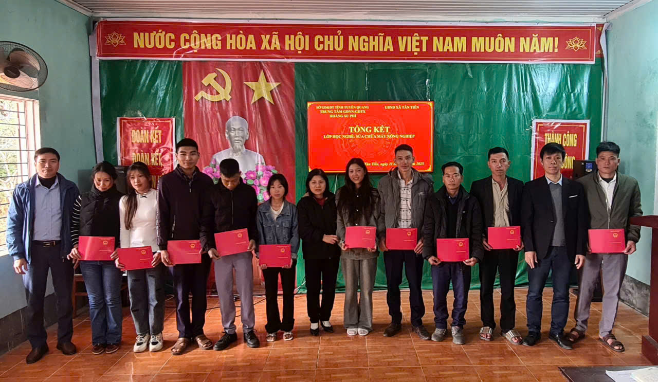 Sáng ngày 11/12, Trung tâm học tập cộng đồng xã Tân Tiến phối hợp với Trung tâm GDNN & GDTX Hoàng Su Phì tổ chức tổng kết và trao chứng chỉ đào tạo nghề “sửa chữa máy nông nghiệp” cho học viên. Dự hội nghị có đồng chí Bùi Thanh Hưởng – PCT UBND xã Tân Tiến, Phạm Thúy Ngân – GĐ Trung tâm GDNN & GDTX Hoàng Su Phì.